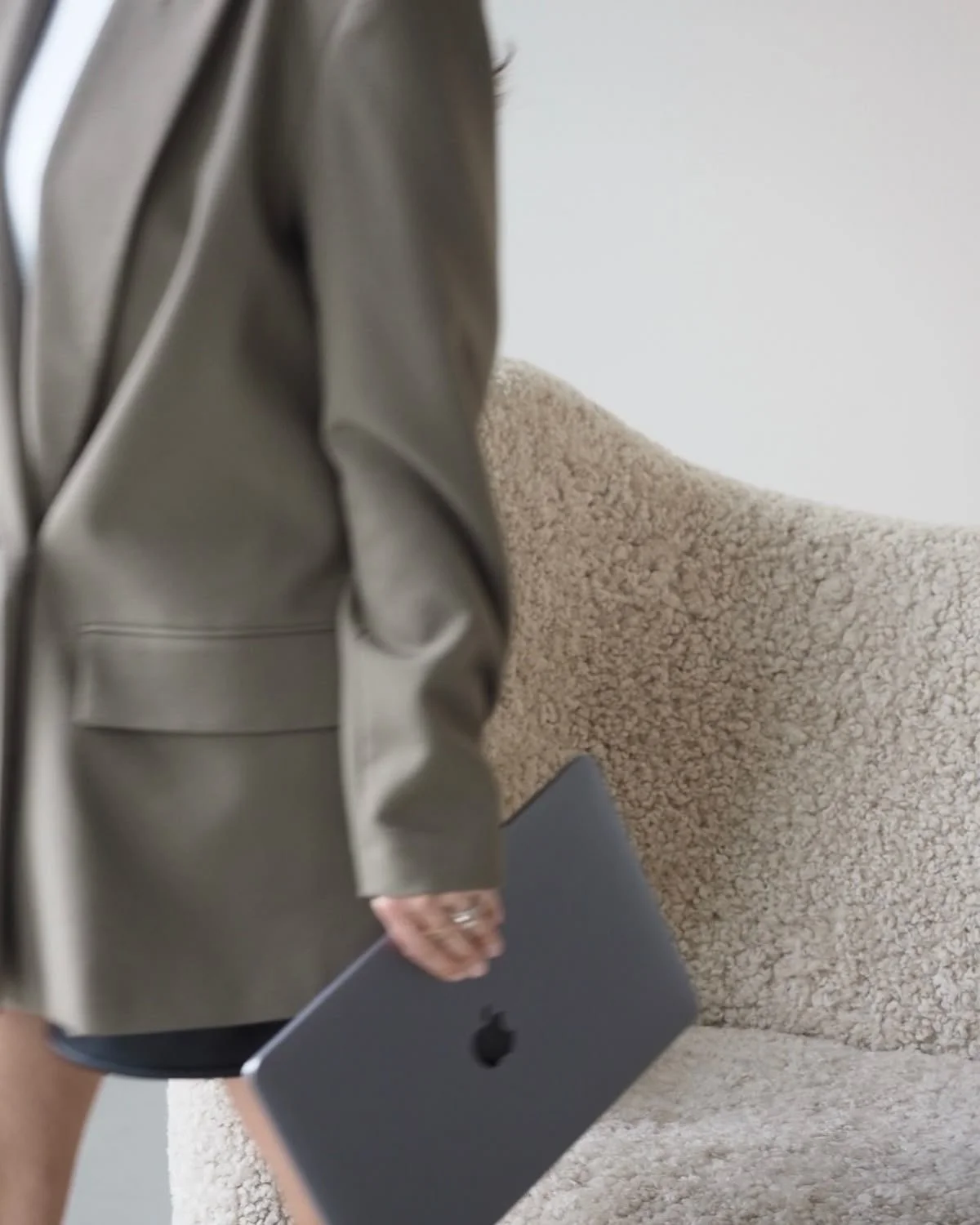 Person holding a closed MacBook laptop, standing next to a beige textured sofa.